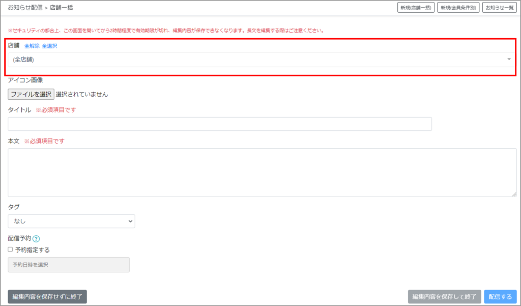 店舗一括で配信する方法と、会員種別等の条件別で配信する方法があります。