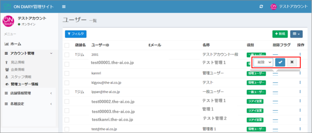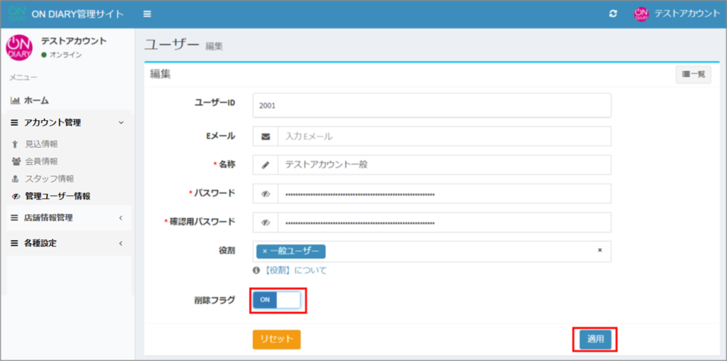ユーザー編集画面で〈削除フラグ〉を押し「削除」に変更し〈適用〉を押す