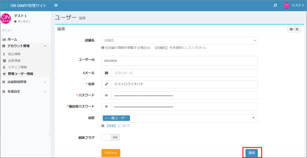 ユーザー編集画面で必要事項を入力して〈適用〉を押す