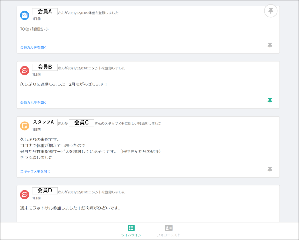 フォローした会員の「最新コメント」「体重記録(前回比)」「スタッフメモ(旧掲示板)」の追加情報が更新順で表示されます。