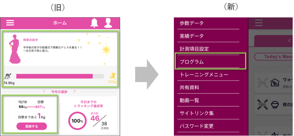 これまでホーム画面に表示されていた『将来の自分』や『今月の目標』などのプログラム情報がサイドメニューの『プログラム』から詳細が確認できるようになりました。