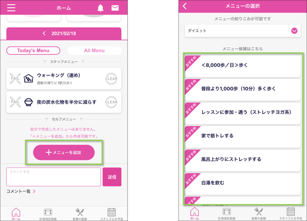 これまで習慣メニューはスタッフが作成したものだけでしたが、セルフメニューとして、会員がアプリで自由に作成できるようになります!