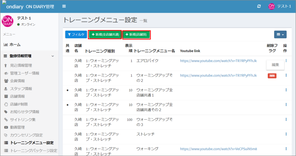 現在スタッフサイトで行っている「カウンセリング設定」「トレーニング設定」がON DIARY管理サイトにて全店舗分一括で追加できるようになりました。