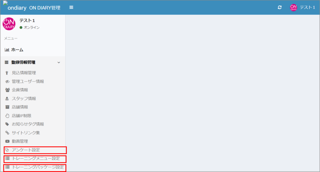 ON DIARY管理サイトの「登録情報管理」機能に、「アンケート設定」「トレーニングメニュー設定」「トレーニングパッケージ設定」が追加されました。