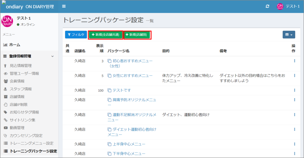 ・スタッフサイトの「トレーニング設定」で行っていた「パッケージ登録」を、ON DIARY管理サイトでは「トレーニングパッケージ設定」として、サイドメニューに追加しました。
