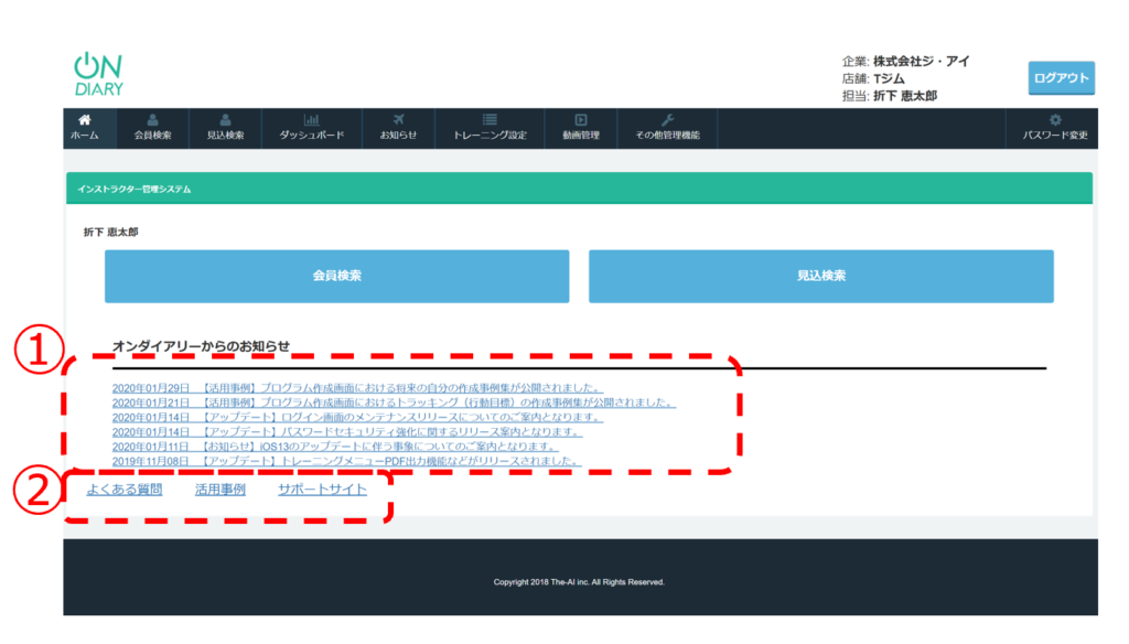 ① 最新のアップデート情報などのお知らせ掲載欄になっております。