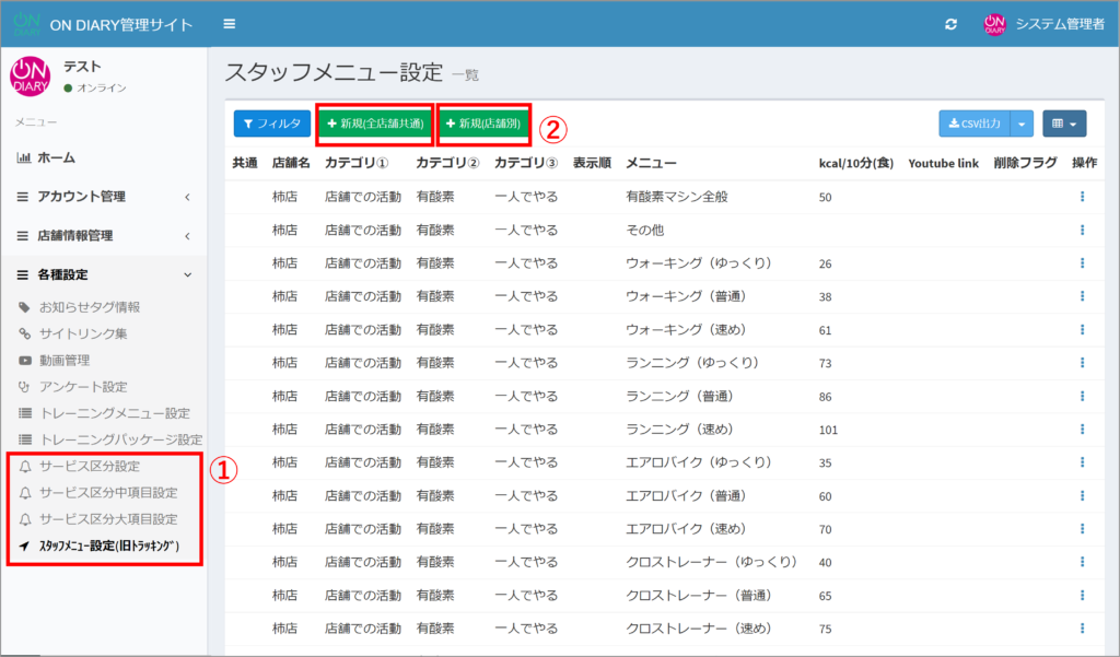 現在スタッフサイトで行っている「サービス区分設定」および「トラッキングメニュー管理」がON DIARY管理サイトにて全店舗分一括で追加できるようになりました。