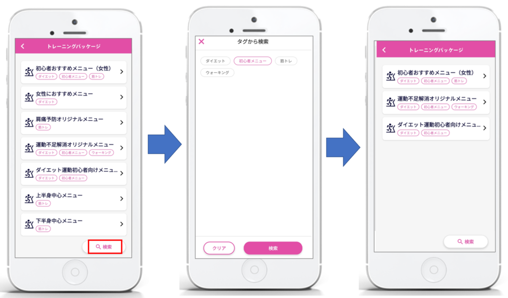 トレーニングパッケージの一覧表示で、各トレーニングパッケージの目的やレベルなどをタグ付きで表示できるようになりました。また、タグで検索することもできるようになり、たくさんのパッケージがある場合も会員が自分に合ったトレーニングパッケージを探しやすくなります。