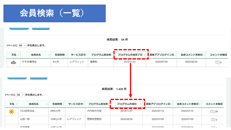 従来、会員カルテ画面や検索一覧画面に「プログラム作成」と「プログラム作成完了」という標記が混在しておりました。(トラッキングを設定している会員としていない会員を区別するため)