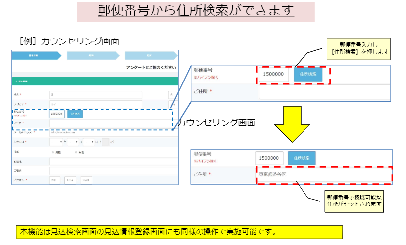 カウンセリング機能に郵便番号検索の機能が追加されました。